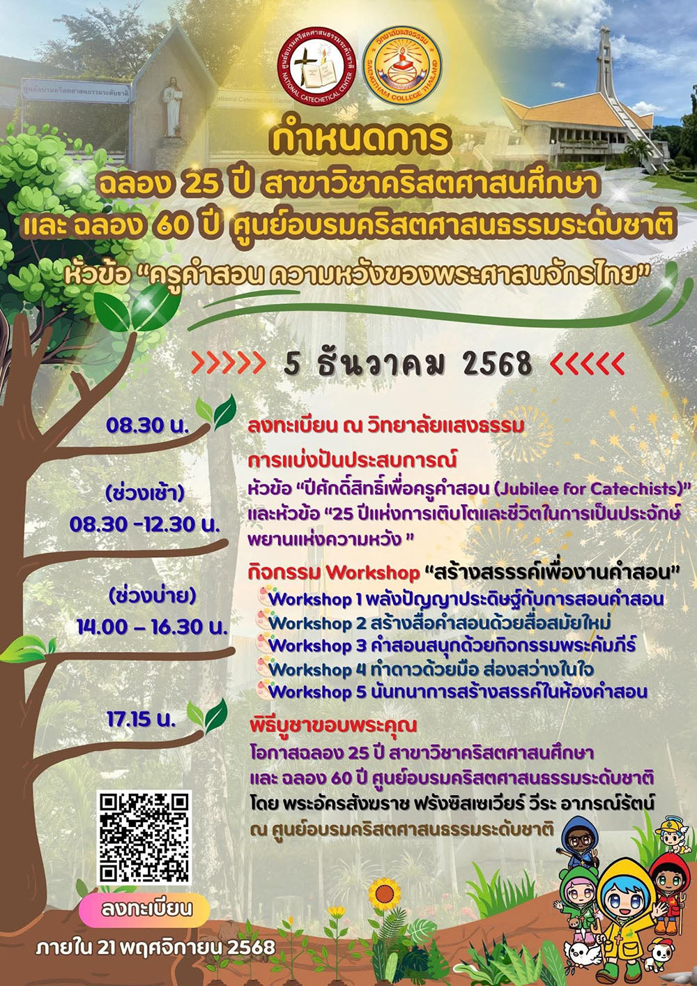 วิทยาลัยแสงธรรม ร่วมกับศูนย์อบรมคริสตศาสนธรรม ระดับชาติ ขอเชิญร่วมงานฉลอง 25 ปี สาขาวิชาคริสตศาสนศึกษา และ ฉลอง 60 ปี ศูนย์อบรมคริสตศาสนธรรม ระดับชาติ ในวันศุกร์ที่ 5 ธันวาคม พ.ศ. 2568